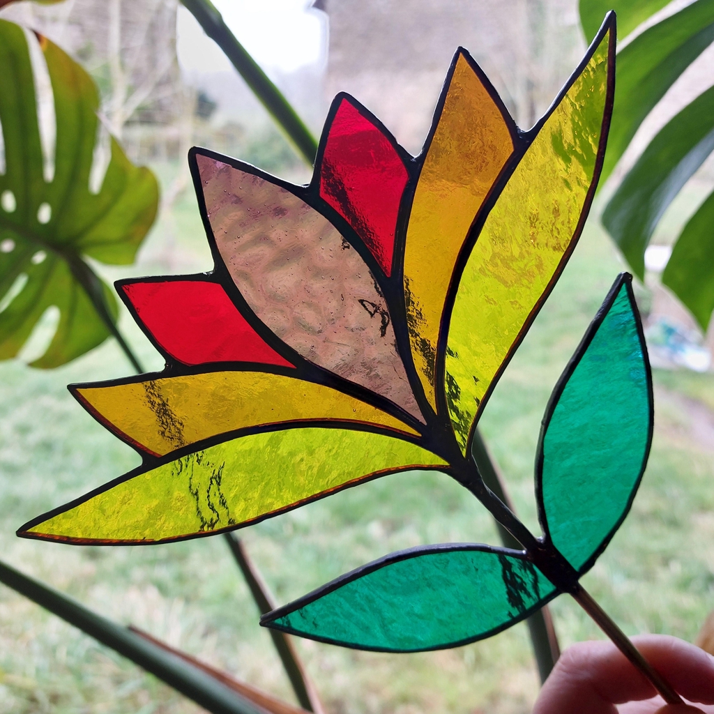Chaque vitrail est fourni avec son support, que ce soit une chaine solide pour les suspensions, un socle en bois pour les fleurs à poser ou une tige en laiton pour les vitraux à piquer dans une plante.